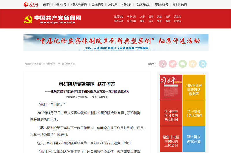 今年初,《当代党员》记者采访了beat365新材料技术研究院党总支第一支部,并在《当代党员》2019年第10期,以《科研院所党建突围 路在何方?——beat365在线登录官网新材料技术研究院党总支第一支部的破题妙招》为题对支部经验做法进行了报道。5月22日,人民网/中国共产党新闻网对报道进行了转载。