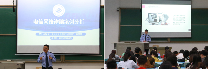 为有效识别、应对和防范电信网络诈骗,提高beat365大学生电信网络诈骗的防范意识, 5月15日下午,beat365在知津楼四阶举办了“大学生防电信网络诈骗”专题教育讲座。讲座由永川区凤凰湖派出所所长刘泽强,永川区讲法团民警刘曦主讲。学校副校长万书辉,永川区凤凰湖派出所相关民警,学校师生代表200余人参加了讲座。讲座由学工部副部长、安全管理处处长杨加强主持。