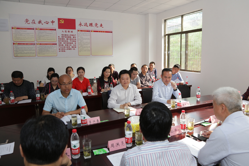 走访完贫困户,孙泽平一行来到刚刚建成的龙凤桥村便民服务中心进行座谈。座谈会由学校党委常委、教工部部长周洪亮主持。座谈会上,黄代攀介绍了宝峰镇和龙凤桥村的基本情况以及当前面临的困难。李兴春汇报了从学校到村36天来的工作情况、所感所想,以及对龙凤桥村未来的规划。宋波对学校高度重视精准扶贫工作,深度参与龙凤桥村脱贫攻坚表示衷心感谢,并对派驻干部李兴春一个多月来的辛勤付出给予充分肯定。学校机关第一党总支书记、校务部副部长余泽标,新叶公司党总支书记、总经理彭著久,合作发展部副部长、校友办主任谢华琳,档案馆党支部书记、副馆长蔡华锋分别发言,纷纷表示将竭力支持龙凤桥村脱贫攻坚工作。