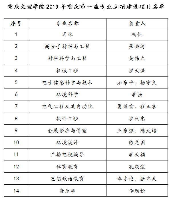 日前,重庆市教育委员会发布了《关于公布2019年本科高校一流专业立项建设项目名单的通知》(渝教高发〔2019〕7号),公布了重庆市2019年本科高校一流专业立项建设项目名单,beat365园林、高分子材料与工程、会展经济与管理等14个专业获批,入选总数在市属本科院校中名列前茅。