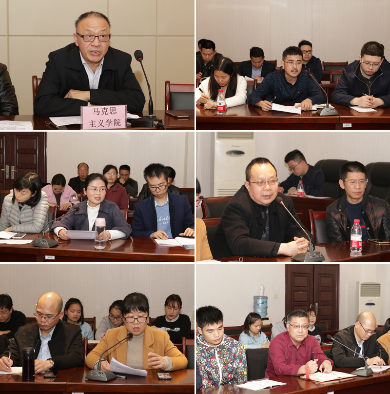 马克思主义学院院长李才俊就目前学校思政课建设情况及下一步工作打算进行了汇报。肖勇、邓永奎、余孝军、江敏、张元圆等与会教师进行了交流发言。大家纷纷表示,习近平总书记的重要讲话站位高、内涵丰富、立意深远。听了总书记的重要讲话,既深受鼓舞,又倍感责任重大,在今后的工作中将进一步提升自身的素质和能力,切实将立德树人的根本任务落到实处。