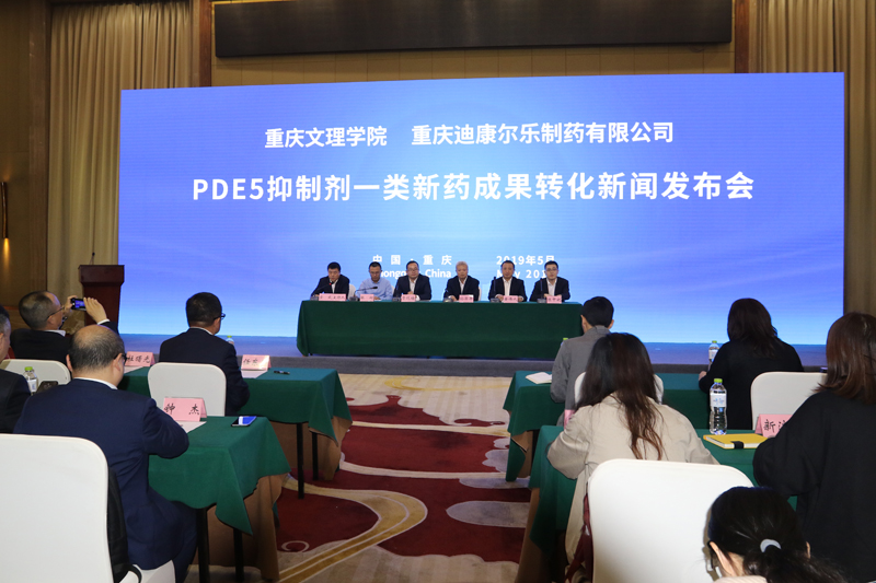 5月29日下午,学校在雾都宾馆重庆厅举行PDE5抑制剂一类新药成果转化新闻发布会。成都迪康药业董事长助理贾现培,重庆市科技局社会发展科技处副处长张柯,学校党委书记孙泽平,党委副书记、校长黄伟九,党委常委、副校长金盛,创新靶向药物国际研究院团队负责人陈中祝出席新闻发布会,光明日报、中国教育报、重庆日报、重庆电视台、中国教育电视台等20余家媒体参加新闻发布会,发布会由金盛主持。
