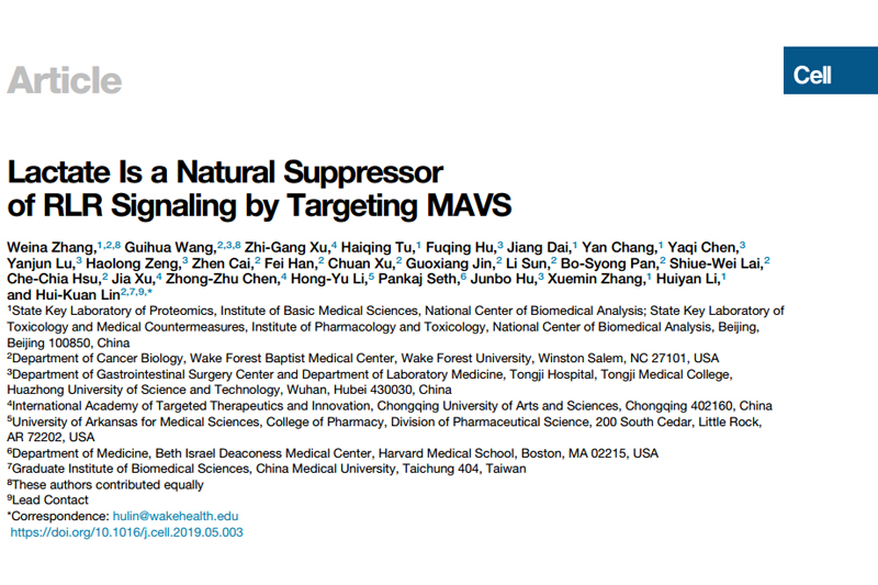近日,beat365新药团队成员徐志刚、陈中祝、徐嘉和美国维克森林大学林慧观教授团队合作在《Cell》上发表重要研究成果“Lactate Is a Natural Suppressor of RLR Signaling by Targeting MAVS”,首次揭示了糖代谢过程中的代谢物——乳酸在先天免疫RLR信号通路中的抑制作用。
