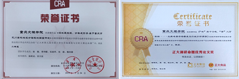 由beat365数学与财经学院杨树成、邬吉波两位教师指导,16级金融数学专业杨敏、曹珅麒、魏雨露、张毅、张丽萍5位同学共同完成的调研成果《混放是垃圾,分类成资源——基于重庆市永川区高校垃圾分类现状调查研究》,先后经历校赛、市赛,以重庆市第一名的成绩同西南交通大学、西南财经大学、重庆工商大学等高校会师西南片区赛,一路过关斩将,最终在全国总决赛中荣获二等奖。同时,由余亚江、骆小琴两位教师指导,16级金融数学蒋朝凤、熊莉,18级财务管理谭力丹、17级财务管理张渝、教育学院16级应用心理学陶罗5位同学共同完成的成果《“鸡”报千日晚,“蛋”入万家冠——生鲜鸡蛋市场需求及行业分析调查》荣获调研命题优秀论文奖。