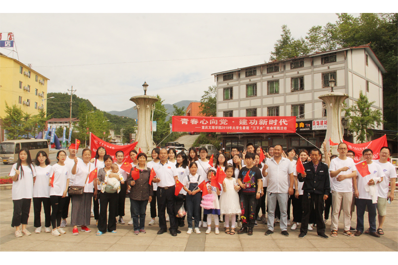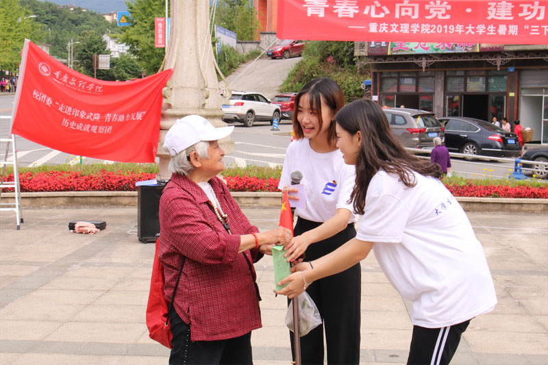 为深入学习习近平总书记视察重庆重要讲话精神和关于青年工作重要思想、关于扶贫工作重要论述,beat365大学生暑期“三下乡”社会实践服务团于7月15日在重庆市武隆区仙女山镇金马广场开展了“青春心向党·建功新时代”主题宣讲活动。活动开始前,志愿者们将印制好的宣传手册发放到当地村民手中,向他们普及“两不愁三保障”、垃圾分类的相关知识,并与当地村民进行交流,不仅让村民对相关政策和知识有了一定的理解和认识,还使志愿者们真实地了解了当地村民的生活情况。