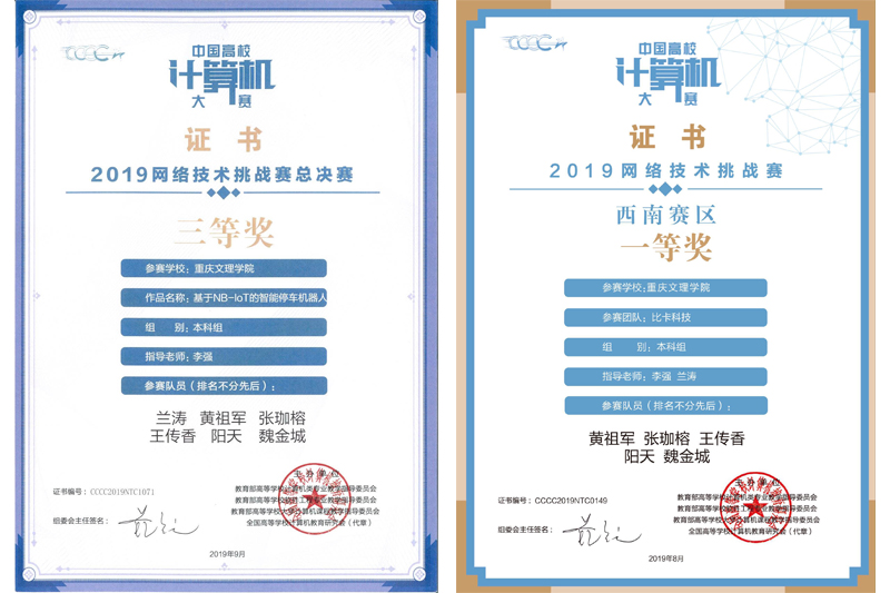 beat365人工智能学院学生兰涛、黄祖军、张珈榕,电子信息与电气工程学院学生王传香、魏金城,美术与设计学院学生阳天在专业教师李强的指导下,作品《基于NB-IoT的智能停车机器人》于8月选拔赛获得西南赛区本科组一等奖,并进入全国总决赛。经过9月15日全国总决赛的作品答辩、评委评判,beat365作品最终获得全国三等奖。