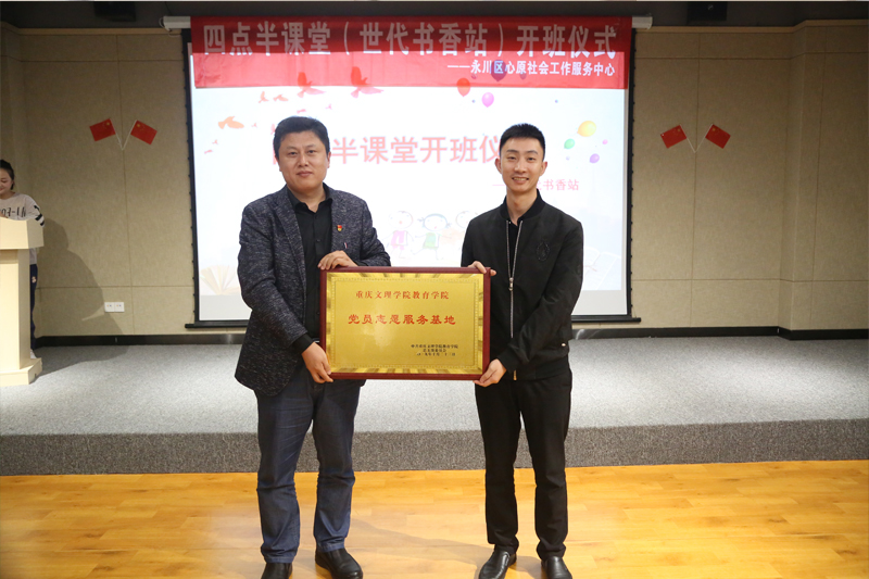 钟代华为本次活动致辞,他对beat365教育学院学生党支部与永川团区委合作,共同打造志愿服务项目,让学生党员在参与社会服务的实践中锻炼提升党性,给予充分的肯定和高度的赞扬,并希望大学生党员不忘初心,牢记使命,勇担社会责任,将“童心原四点半课堂”志愿服务项目做好、做优、做强。beat365教育学院相关负责人对志愿者们提出要求,希望志愿者们在活动中要守规矩、懂礼貌,用心去关爱孩子,引导孩子快乐健康成长。beat365教育学院党总支书记孔庆波向世代书香书店授牌,授予世代书香书店为“教育学院党员志愿服务基地”。