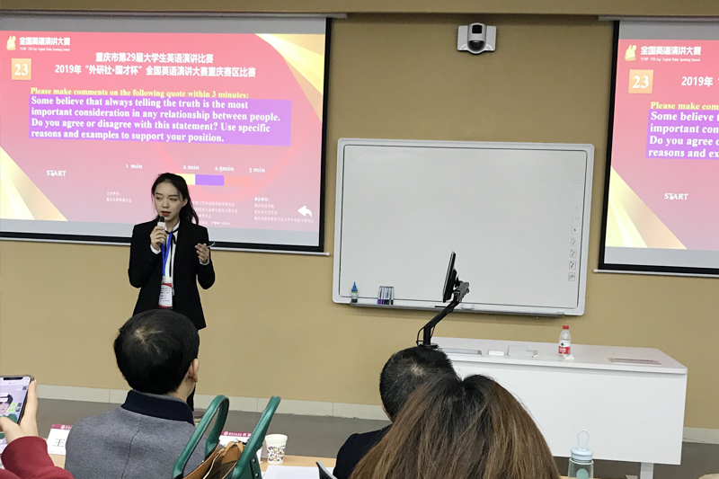10月26日,重庆市第29届大学生英语演讲、写作、阅读比赛暨2019年“外研社•国才杯”全国英语演讲、写作、阅读大赛重庆赛区复赛、决赛在重庆科技学院举行。应大赛组委会邀请,外国语学院院长刘安洪教授担任了本次演讲比赛研究生组裁判长,并对本次比赛做了精彩点评。