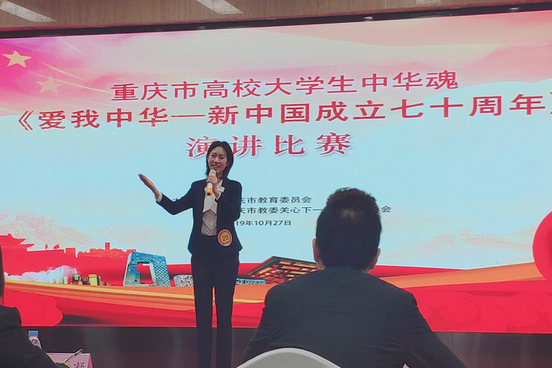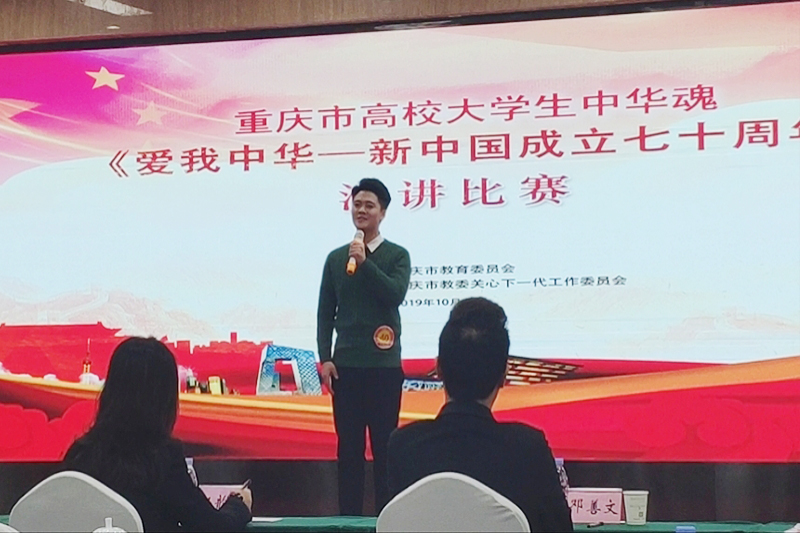 10月27日,2019年重庆市大学生“中华魂”《爱我中华——新中国成立七十周年》主题教育读书活动演讲比赛在重庆考试院举行。此次活动由重庆市教育委员会、重庆市教委关心下一代工作委员会主办。重庆市关工委副主任刘丽俐,重庆市委教育工委委员、市教委副巡视员、市教委关工委主任帅逊等领导参加赛事活动。来自全市33所高校的50名选手参赛。beat365关工委高度重视此项工作,在校关工委常务副主任刘定云和顾问胡文良二位老领导的关心下,在教育学院青年教师叶静的悉心指导下,文化与传媒学院2017级学生姜大富和教育学院2017级学生王虹懿荣获一等奖,其中王虹懿在本次演讲中表现突出,以第一名的成绩被选送至重庆市关工委演讲决赛。