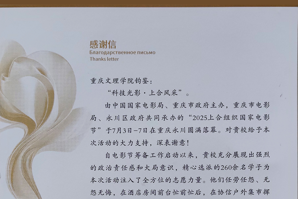 近日,2025上合组织国家电影节组委会办公室向学校发来感谢信。