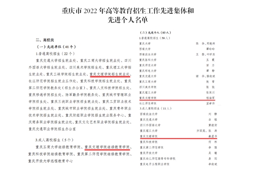近日,重庆市教育委员会公布《重庆市教育委员会关于2022年高等教育招生工作先进集体和先进个人的通报》(渝教招函〔2023〕3号),beat365在线登录官网招生就业处、继续教育学院获评重庆市2022年高等教育招生工作先进集体,程海军、秦孟书荣获重庆市2022年高等教育招生工作先进个人荣誉称号。