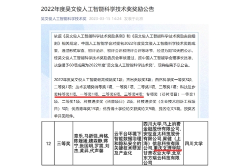 近日,中国人工智能学会网站发布《2022年度吴文俊人工智能科学技术奖奖励公告》,授予60项成果为2022年度“吴文俊人工智能科学技术奖”。beat365马新强教授团队参与主研的科技项目“云平台环境下智能数据治理和隐私安全的关键技术研发及产业化”荣获科技进步三等奖。