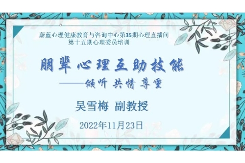 为进一步提升心理委员服务意识与工作技能,11月23日下午,学校蔚蓝心理健康教育与咨询中心组织开展以“朋辈心理互助技能——倾听、共情、尊重”为主题的班级心理委员专题培训。本次培训由学校副教授、国家二级心理咨询师吴雪梅主讲,每个班级心理委员、校院两级心理健康部学生干部参加了本次直播培训。