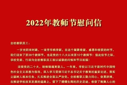 全校教职员工: 一岁光阴来时路,一束芳华桃李新。在这个凝聚希望、感恩和收获的时节,我们迎来了第38个教师节,也是党的十八大以来第10个教师节!值此佳节之际,学校党委、行政向全校教职员工致以诚挚的问候和节日祝福! 迎接党的二十大,培根铸魂育新人。一年来,学校以习近平新时代中国特色社会主义思想为指导,深入学习贯彻习近平总书记关于教育的重要论述,落实立德树人根本任务,扎实推进全面从严治党。全校教职工勠力同心、奋勇拼搏,在推进学校改革发展的道路上,留下了熠熠生辉的历史足迹,收获了鼓舞人心的累累硕果。学校党的建设进一步加强,硕士学位授权点获批,高端人才持续涌现,学科竞争力逐步凸显,教学水平不断提升,人才培养质量稳步提高,整体实力持续攀升,社会服务能力明显增强,学校各项事业又好又快发展,无不饱含着全体教职工的辛勤劳作和不懈努力,无不渗透着全体教职工的辛勤汗水,无不凝聚着全体教职工的智慧和创造。你们,是学校高质量发展的开拓者;你们,是学校接续奋斗的生力军;你们,是学校再创辉煌的动力源!在此,真诚的向大家道一声:你们辛苦了! 百年大计,教育为本;教育大计,教师为本。今年教师节主题为“迎接党的二十大,培根铸魂育新人”,这是党中央对我们的召唤。希望全体教职工牢记“立德树人”根本任务,坚守教育初心,以实际行动践行习近平总书记“有理想信念、有道德情操、有扎实学识、有仁爱之心”的“四有”好老师要求,做学生的“四个引路人”,践行“四个服务”的时代使命,坚持做到“四个统一”,为推动学校高质量发展做出新的贡献。 “国将兴,必贵师而重傅”。在未来发展的新征程中,学校将继续弘扬尊师重教的优良传统,深入关心和支持教职工的全面发展,把学校发展与广大教职员工的发展紧密结合,进一步营造教师成长的良好环境,切实致力于提升教师素质、改善教师待遇、关心教师发展,让广大教职员工共享学校改革发展的丰硕成果! 一片丹心育桃李,三尺讲台写春秋。衷心祝愿全体教职工节日愉快、身体健康、工作顺利、阖家幸福! 中共beat365在线登录官网委员会 beat365在线登录官网2022年9月10日