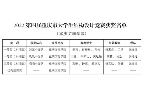 近日,重庆市教委通报了2022年第四届重庆市大学生结构设计竞赛暨第十五届全国大学生结构设计竞赛重庆市分区赛获奖情况(渝教高函〔2022〕54号),beat365土木工程学院组成的三支学生团队分别获得本科组一等奖2项(共3项)、三等奖1项(共8项),学校获得优秀组织奖。