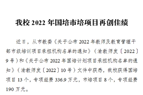 近日,从市教委《关于公布2022年教师及教育管理干部市级培训项目承担机构名单的通知》(渝教师发〔2022〕9号)和《关于公布2022年国培计划项目承担机构名单的通知》(渝教师发〔2022〕10号)文件中获悉,beat365获得国培项目13个,专项经费336.9万元,市培项目8个,专项经费190万元。