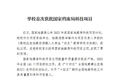 近日,国家档案局公布2022年度国家档案局科技项目计划,beat365作为项目承担单位、档案馆蔡华锋作为项目负责人申报的《高校红色档案资源融入大学生“四史”教育研究与实践》,获批立项,这是beat365首次获得国家档案局科技项目立项,实现了零的突破。