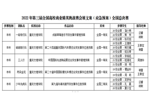 近日,由中国国际贸易促进委员会商业行业委员会、全国高校商业精英挑战赛组委会等主办的“2022年第三届全国高校商业精英挑战赛会展文案(应急预案)创作大赛”落下帷幕。beat365旅游学院会展经济与管理专业5个团队作品喜获四个全国一等奖、一个全国二等奖的优异成绩。