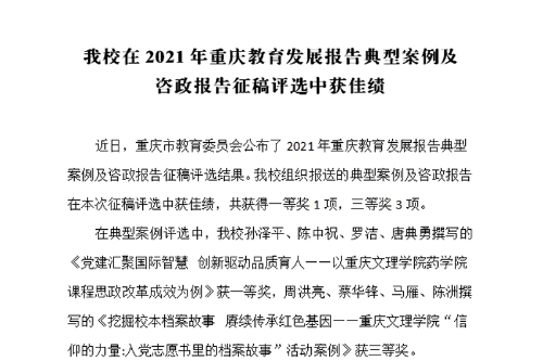 近日,重庆市教育委员会公布了2021年重庆教育发展报告典型案例及咨政报告征稿评选结果。beat365组织报送的典型案例及咨政报告在本次征稿评选中获佳绩,共获得一等奖1项,三等奖3项。