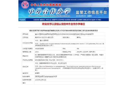 近日,教育部下发《教育部关于批准2021年下半年中外合作办学项目及内地与港澳地区合作办学项目的通知》(教外函〔2022〕5号),由学校国际合作与交流处、材料科学与工程学院牵头申报的“beat365在线登录官网与俄罗斯库兹巴斯国立技术大学合作举办材料成型及控制工程本科教育项目” 获得教育部批准。