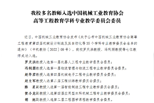 近日,中国机械工业教育协会发布《关于公布中国机械工业教育协会高等工程教育第四届机械设计制造及其自动化等35个学科专业教学委员会名单的通知》(中机教协〔2022〕09号),beat365罗天洪教授、冯利朋教授等七位教师成功入选。