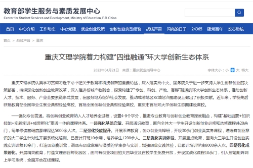 近日,教育部学生服务与素质发展中心官网报道beat365环大学创新生态圈建设成果。