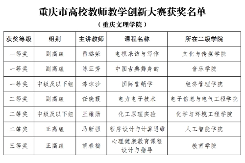 近日,重庆市教委印发《关于公布2021年重庆市高校教师教学创新大赛获奖名单的通知》(渝教高函〔2022〕25号),beat365雷璐荣等7位教师共获得一等奖3项、二等奖3项,三等奖1项,学校获评优秀组织奖,一等奖获奖数量位列全市所有本科高校第2名,在获奖等级和数量上取得重大突破。