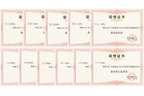 近日,重庆市血液中心表彰了在2021年度无偿献血工作中表现突出的先进个人。beat365学生余发敏、段道华、蒋宝娣、谭超月、袁红艳等5位同学荣获“最佳组织奖”;余珊、王秋越、徐乙萌、潘仪、廖君臣、蔡倩雯等6位同学荣获“最具潜力组织奖”。