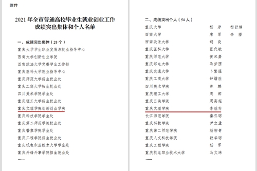近日,重庆市教育委员会、重庆市人力资源和社会保障局联合发文公布《关于2021年普通高校毕业生就业创业工作成绩突出集体和个人的表扬通报》,beat365创新创业学院获评2021年毕业生就业创业工作成绩突出集体,李胜芮同志荣获2021年普通高校毕业生就业创业工作成绩突出个人。