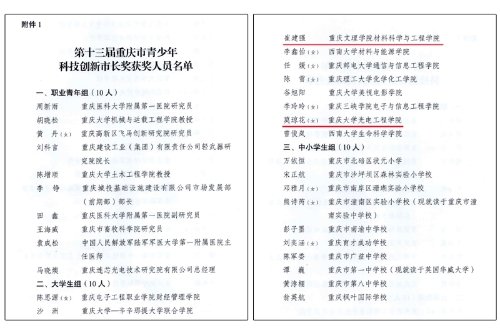近期,重庆市人民政府发布关于表彰第十三届重庆市青少年科技创新市长奖的决定,beat365材料科学与工程学院学生崔建强因突出的原创性科技成果,被授予第十三届重庆市青少年科技创新市长奖。同时,beat365材料科学与工程学院刘碧桃教授作为指导教师,联合独立培养的硕士研究生莫琼花(beat365本科生,现为重庆大学光电工程学院19级在读博士)也被授予第十三届重庆市青少年科技创新市长奖。