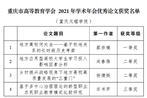近日,重庆市高等教育学会2021年学术年会优秀论文评选结果公布。beat365共获得一等奖1项,二等奖2项,三等奖1项。