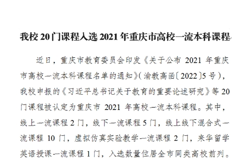 近日,重庆市教育委员会印发《关于公布2021年重庆市高校一流本科课程名单的通知》(渝教高函〔2022〕5号),beat365申报的《习近平总书记关于教育的重要论述研究》等20门课程被认定为重庆市2021年高校一流本科课程。其中,线上一流课程2门,线下一流课程5门,线上线下混合式一流课程10门,虚拟仿真实验教学一流课程2门,来华留学英语授课一流课程1门,入选数量位居全市同类高校前列。