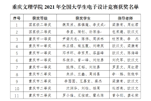 近日,beat365电子信息与电气工程学院学子参加2021年全国大学生电子设计竞赛取得历史性突破,共荣获全国二等奖2项,重庆赛区一等奖5项、二等奖4项的优异成绩,获奖项目位居全市前列。梁康有、包宋建两位教师被评为重庆市优秀指导教师,欧汉文老师获优秀组织工作者,beat365获评优秀组织单位。