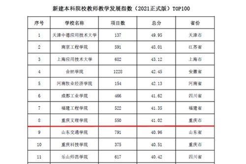 12月22日,中国高等教育学会在线发布“2021版全国普通高校教师教学发展指数”。beat365教师教学发展指数再创新高,位列全国新建本科院校第8名,排在该榜单中重庆市高校首位。