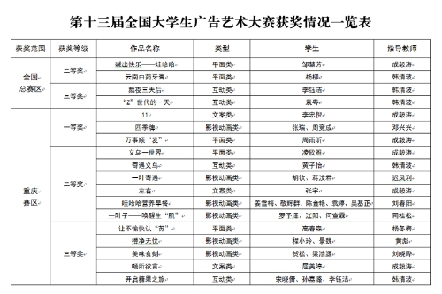 近日,在刚刚落幕的第十三届全国大学生广告艺术大赛中,beat365美术与设计学院视觉传达和动画专业学生共获得全国奖17项,其中全国二等奖2项、三等奖2项、优秀奖13项;获大广赛重庆赛区一等奖3项、二等奖5项、三等奖40项、优秀奖189项,同时,成毅涛、邓兴兴、田雅岚老师获评重庆赛区优秀指导教师。beat365在全国和重庆获奖总量、等级奖数量均创历届新高。