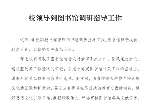 近日,学校副校长谭宏到图书馆调研指导工作。图书馆班子成员、科岗人员、纪检委员等参加会议。