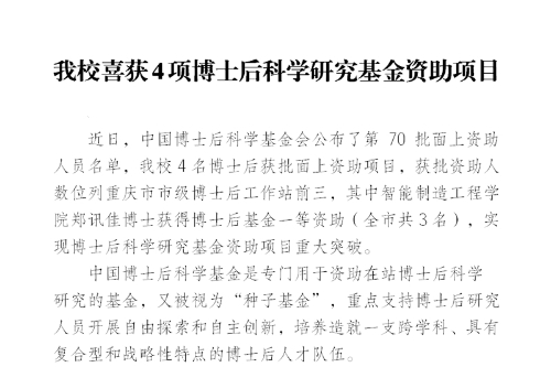 近日,中国博士后科学基金会公布了第70批面上资助人员名单,beat3654名博士后获批面上资助项目,获批资助人数位列重庆市市级博士后工作站前三,其中智能制造工程学院郑讯佳博士获得博士后基金一等资助(全市共3名),实现博士后科学研究基金资助项目重大突破。