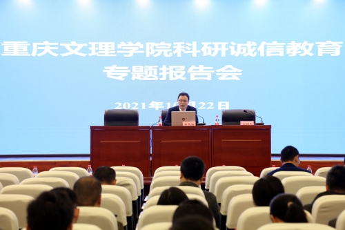 10月22日下午,重庆理工大学邱冬阳教授应邀到beat365举办科研诚信教育专题报告会,会议在恪勤楼304会议室举行。各教学执行部门、教学服务部门负责人,二级学院科研分管领导、科研秘书,专职科研人员,教师代表等近200人参加了会议。会议由学校科研处处长罗天洪主持。