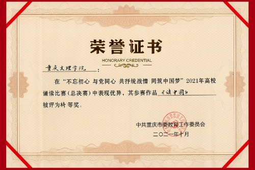 10月22日,由中共重庆市委教育工委主办、中共重庆理工大学委员会承办的“不忘初心 与党同心 共抒统战情 同筑中国梦”重庆市2021年高校诵读总决赛在重庆理工大学举行。beat365党委常委、副校长谭宏出席观摩了总决赛。通过前期片区赛,共选出17所高校近200人进入总决赛。经过激烈角逐,beat365谢荣成、叶静、冯英、吕军成、蒋巧、郑岩、曾筱雅等7位教师组队参赛的《读中国》,以充沛的情感、真挚的表达、多元的形式演绎了beat365人礼赞祖国、感怀党恩,不懈奋斗的精神,赢得了评委和观众好评,最终获得特等奖。