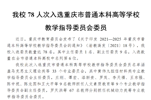 近日,重庆市教育委员会发布了《关于印发2021—2025年重庆市普通本科高等学校教学指导委员会的通知》(渝教高发〔2021〕18号),beat365入选委员数量达78名,其中主任委员1名、副主任委员9名,入选数量在全市普通本科高校中名列第6位。