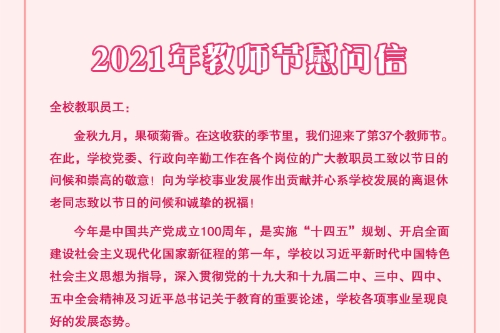 全校教职员工: 金秋九月,果硕菊香。在这收获的季节里,我们迎来了第37个教师节。在此,学校党委、行政向辛勤工作在各个岗位的广大教职员工致以节日的问候和崇高的敬意!向为学校事业发展作出贡献并心系学校发展的离退休老同志致以节日的问候和诚挚的祝福! 今年是中国共产党成立100周年,是实施“十四五”规划、开启全面建设社会主义现代化国家新征程的第一年,学校以习近平新时代中国特色社会主义思想为指导,深入贯彻党的十九大和十九届二中、三中、四中、五中全会精神及习近平总书记关于教育的重要论述,学校各项事业呈现良好的发展态势。 十三五期间,学校已建成3个国家级平台,22个市级科研平台,科研项目持续增长,累计获得国家级项目79项、市级及以上科研成果奖45项,获得授权专利800余项;同时,高质量、高水平学术论文数量大幅增加,达到1800余篇;具有自主知识产权的PDE5抗抑制剂国际一类新药获得国家药品监督管理局和美国FDA临床批文,并以3000万元成功转化;纳米银线系列专利、脱毒生姜连作技术、猕猴桃良种脱毒工厂育苗技术等一批新技术成果正在进行转化和推广应用;主办的《重庆高教研究》入选《中文核心期刊要目总览》(2020)、CSSCI扩展版来源期刊目录(2021—2022)、RCCSE中国核心学术期刊(A)(2020)、WAJCI世界学术期刊学术影响力指数统计源期刊、JST日本科学技术振兴机构数据库来源期刊。 学校坚持开放办学,与美国、俄罗斯、意大利、马来西亚等国30多所高校签订了合作协议,先后开展了师生交流、合作办学、合作科研、来华留学等项目。学校全方位改革、多角度创新、超常规发展的模式被新华社、中国青年报等媒体誉为“beat365现象”,《中国教育报》头版头条专题报道了beat365转型发展成绩。 学校坚持人才培养聚力脱贫,获“全国脱贫攻坚先进集体”荣誉称号,是全市教育系统唯一获此殊荣的单位。为推动乡村全面振兴,组建市属本科高校第一所“乡村振兴学院”,牵头成立成渝地区双城经济圈“乡村振兴学院联盟”,联合地方筹建“重庆乡村振兴研究院”,成功获批成渝地区双城经济圈乡村振兴国家级专家服务基地。 百年树人成伟业,一颗丹心报党恩。在收获赞誉和敬重的同时,我们更要时刻牢记肩负的神圣使命和光荣职责。希望广大教职员工一如既往的发扬优良传统,以培育人才、传承文明、发展先进文化和推动社会进步为己任,自觉为人师表,模范履职尽责,在“十四五”规划开局之年,继续鼓足干劲,抢抓发展机遇,深入推进学校转型发展,为把beat365早日建成区域性、国际化、高水平应用型大学而努力奋斗! 祝大家教师节快乐! 中共beat365在线登录官网委员会 beat365在线登录官网 2020年9月9日