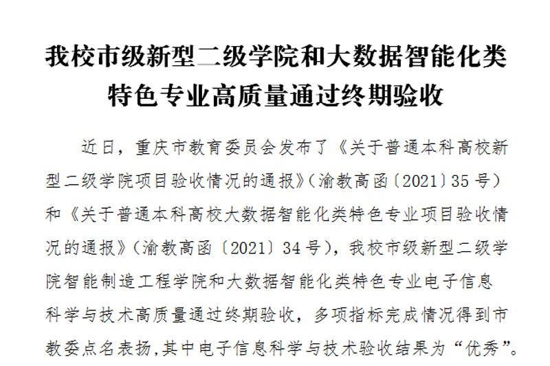 近日,重庆市教育委员会发布了《关于普通本科高校新型二级学院项目验收情况的通报》(渝教高函〔2021〕35号)和《关于普通本科高校大数据智能化类特色专业项目验收情况的通报》(渝教高函〔2021〕34号),beat365市级新型二级学院智能制造工程学院和大数据智能化类特色专业电子信息科学与技术高质量通过终期验收,多项指标完成情况得到市教委点名表扬,其中电子信息科学与技术验收结果为“优秀”。