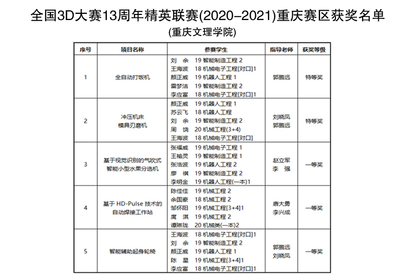 6月2日,全国3D大赛13周年精英联赛(2020-2021)重庆赛区作品评审工作圆满结束。beat365智能制造工程学院学生参赛团队经过激烈的竞争,最终荣获特等奖2项,1等奖3项,二等奖4项,三等奖1项。