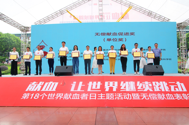 6月11日,重庆市第18个世界献血者暨无偿献血表彰活动在重庆学田湾人民广场举行。beat365副校长李天福、校团委负责人参加表彰活动。