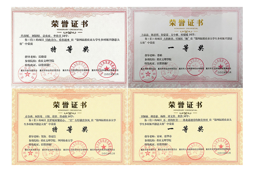 近日,由重庆市教育委员会、重庆市农业农村委员会、重庆市人力资源和社会保障局、重庆市文化和旅游发展委员会联合主办的第四届重庆市大学生乡村振兴创意大赛获奖名单公布,beat365学生荣获特等奖2项,一等奖2项,二等奖9项,三等奖9项,指导教师雷璐荣、贺海、娄娟、宋双获评“优秀指导教师”,学校荣获“优秀组织单位”。