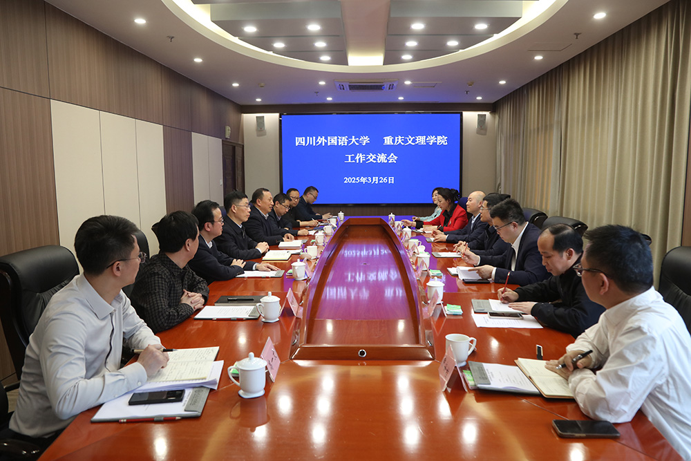 3月26日下午,四川外国语大学党委书记邹渝、校长董洪川、副校长王仁强一行来校调研交流。学校党委书记蔡家林、校长黄伟九、党委副书记祝朝伟、副校长李璐出席交流会。