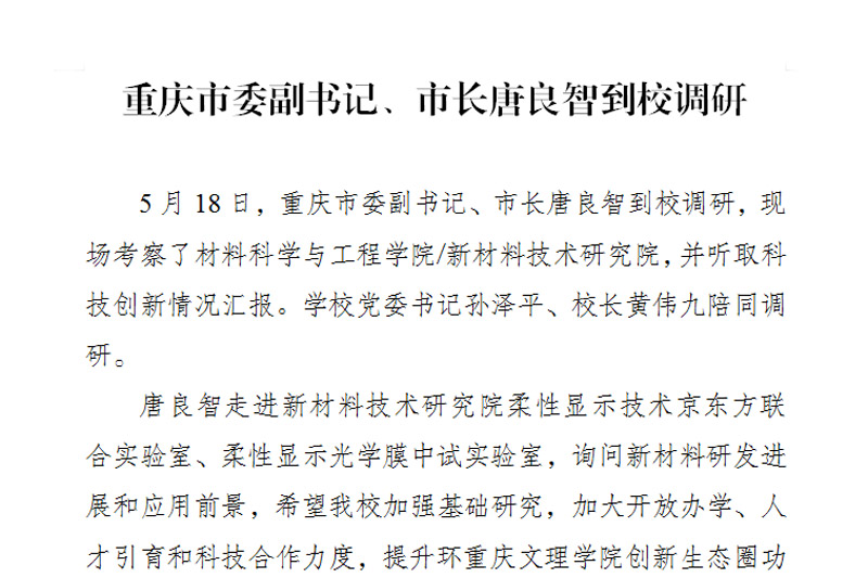 5月18日,重庆市委副书记、市长唐良智到校调研,现场考察了材料科学与工程学院/新材料技术研究院,并听取科技创新情况汇报。学校党委书记孙泽平、校长黄伟九陪同调研。