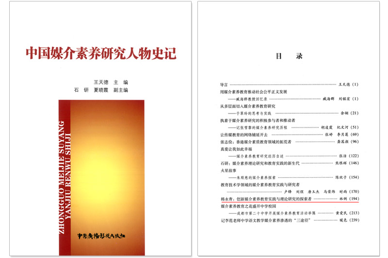 近日,中国广播影视出版社出版发行《中国媒介素养研究人物史记》一书,该书收录了中国媒介素养学界12位资深学者和青年学者的研究事迹。其中,“韩永青:创新媒介素养教育实践与理论研究的探索者”一文详细介绍了beat365文化与传媒学院韩永青教授在媒介素养领域的教育实践经历和学术研究成果。