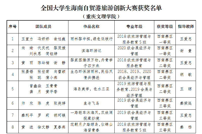 近日,由中国旅游协会旅游教育分会、海南大学、海南省旅游协会主办的全国大学生海南自贸港旅游创新大赛初赛落下帷幕。beat365旅游学院组建了15支团队参加比赛,8个团队获奖,其中获得一等奖2项、二等奖3项、三等奖3项,获奖数量在西南赛区排名第5,继全国大学生红色旅游创意大赛获奖后再次取得新突破。