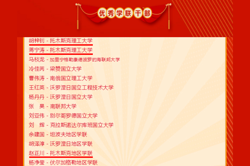 近日,2020年度中国留俄学生总会的表彰名单公布,beat365与俄罗斯托木斯克理工大学联合培养的2016级材料科学与工程专业国际班学生赵正川、2017级材料科学与工程专业国际班学生蒋宁涛、胡梓钊获评优秀学联干部。共有来自莫斯科国立大学、莫斯科鲍曼国立技术大学、莫斯科物理技术大学、俄罗斯人民友谊大学、托木斯克理工大学等45个高校及学联的94名同学被中国留俄学生总会表彰。